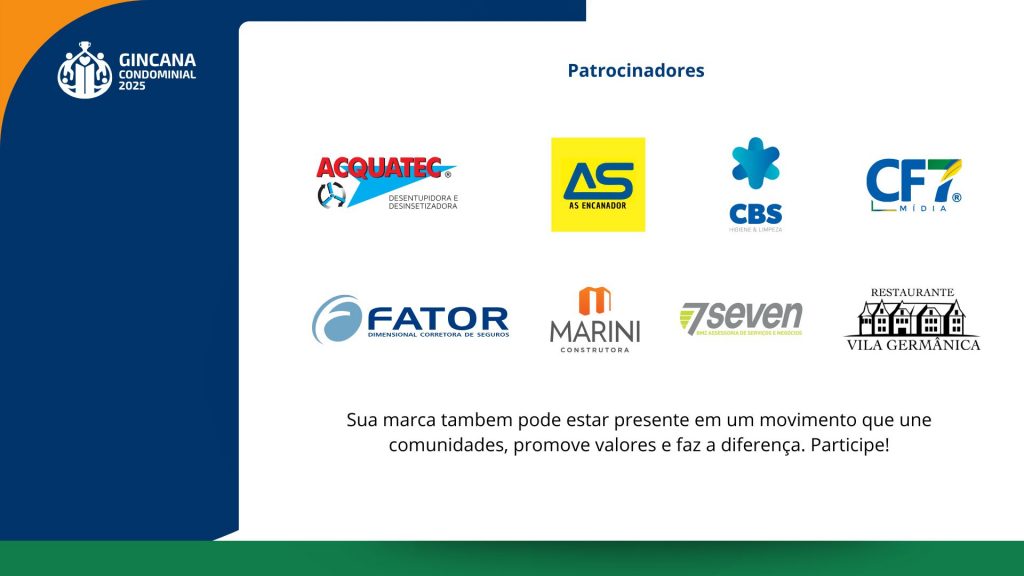 Assim, além de promover união e solidariedade entre vizinhos, a gincana também cumpre um papel fundamental: dar visibilidade às empresas que ajudam a construir, no dia a dia, um condomínio mais funcional, seguro e bem cuidado. Uma integração que valoriza todos os envolvidos na vida condominial, criando conexões e amizades.