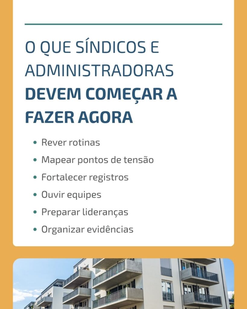 Traduzindo isso para a gestão condominial: quanto mais improvisada for a rotina, mais frágil tende a ser a conformidade. E quanto mais organizados forem os registros, os fluxos e as evidências, maior será a capacidade de demonstrar prevenção real.